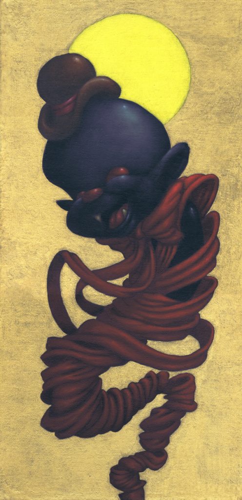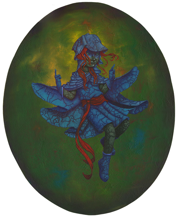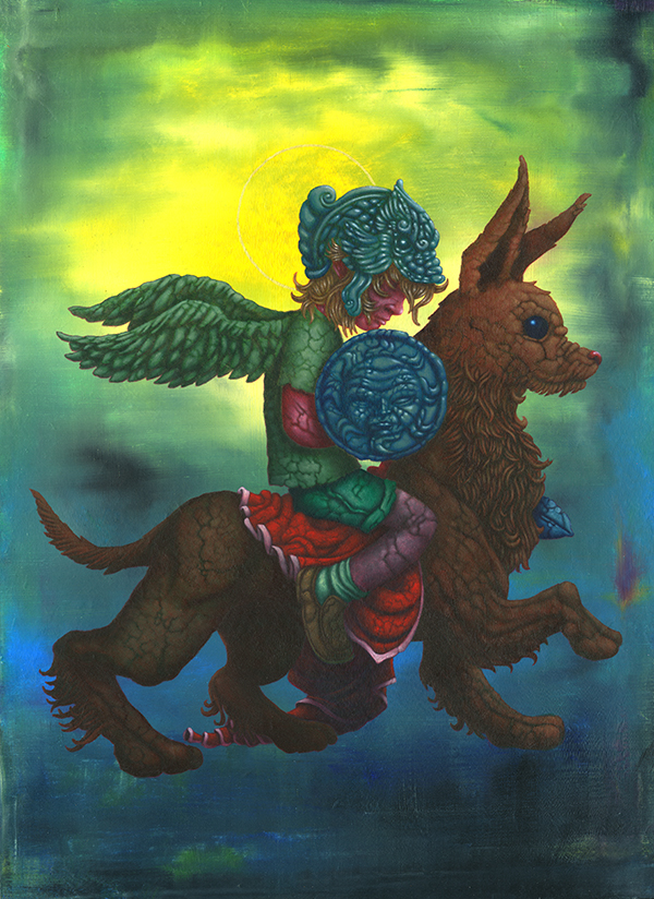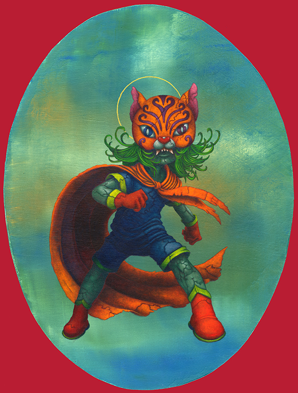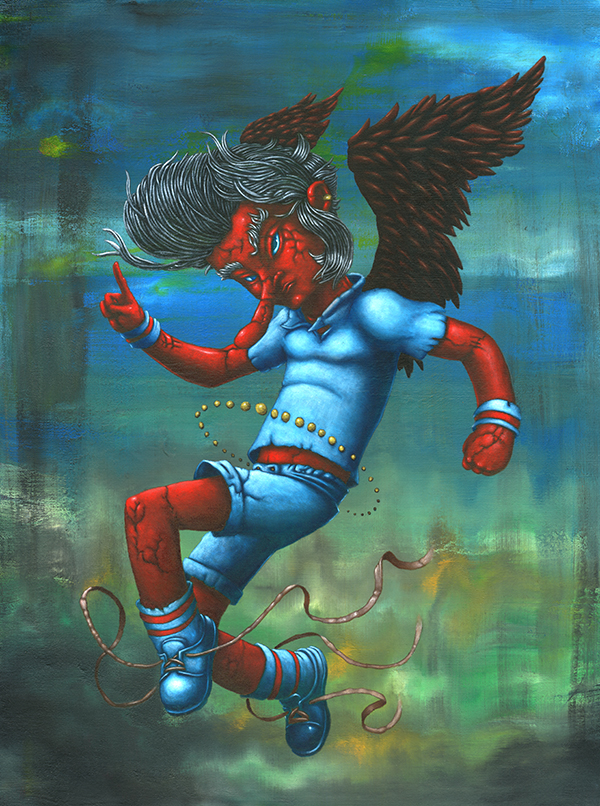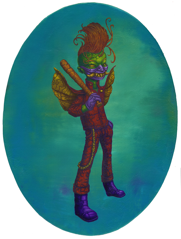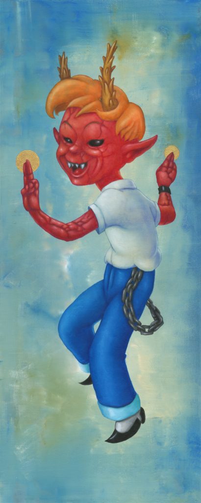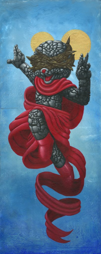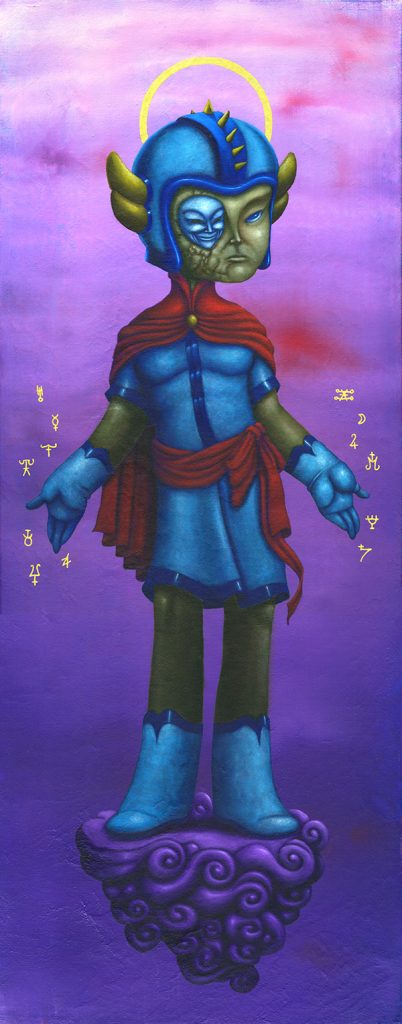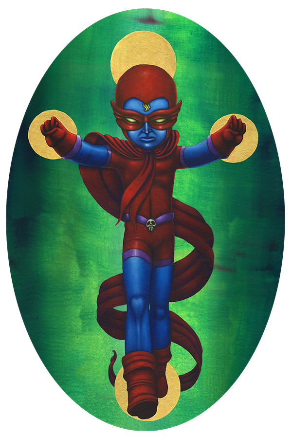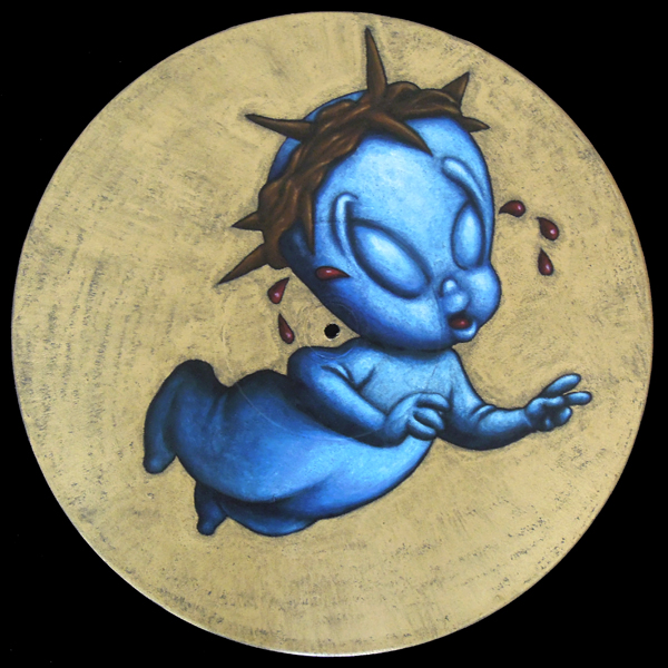 I use oil sticks and acrylic on wood panels. The golden halos are made with gouache.