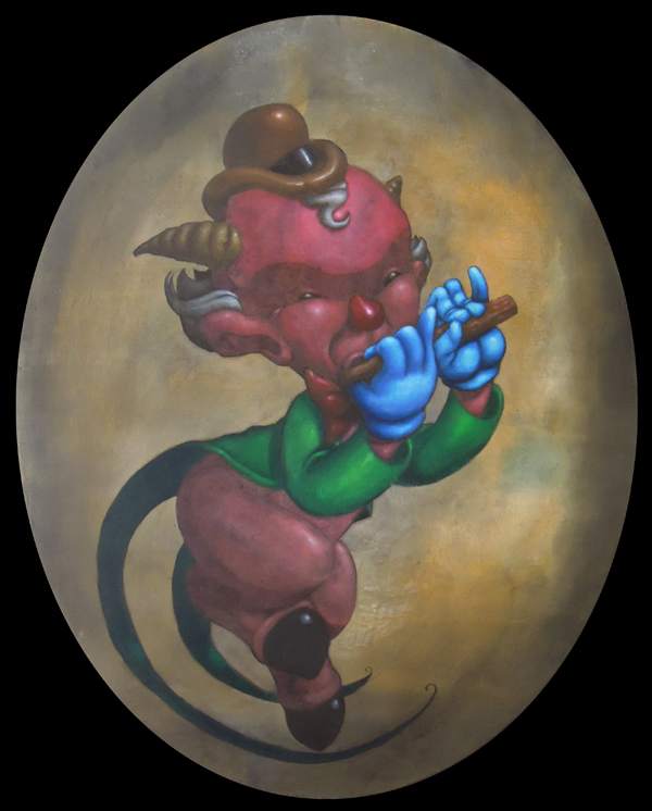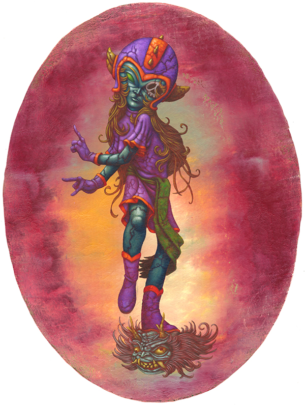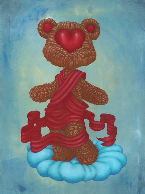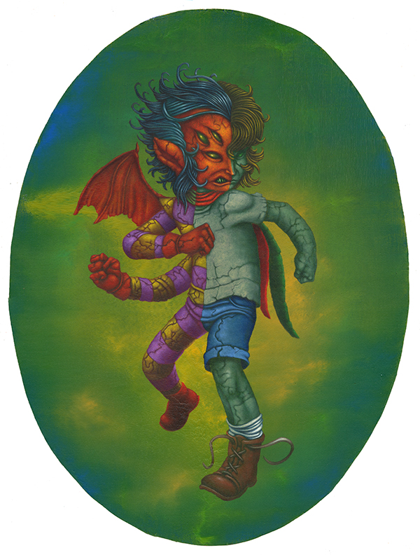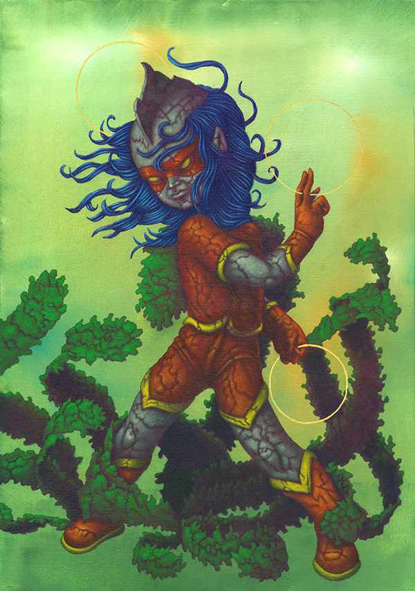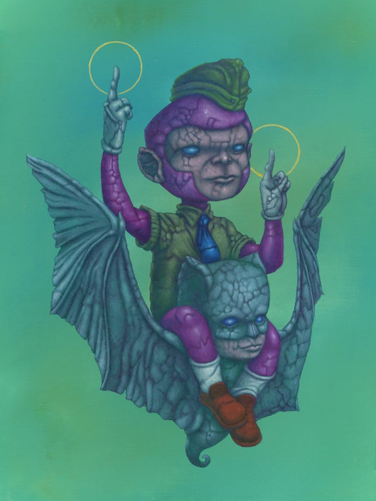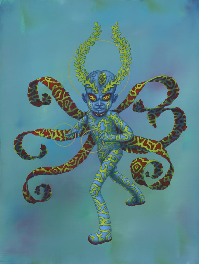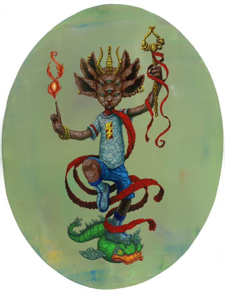 I use oil sticks and acrylic on wood panels. The golden halos are made with gouache.