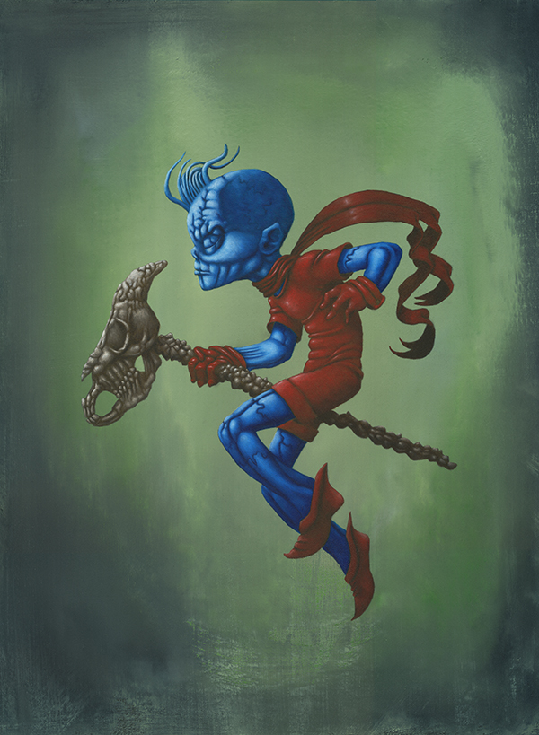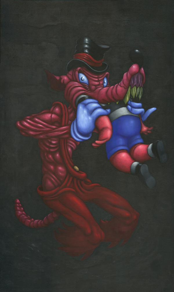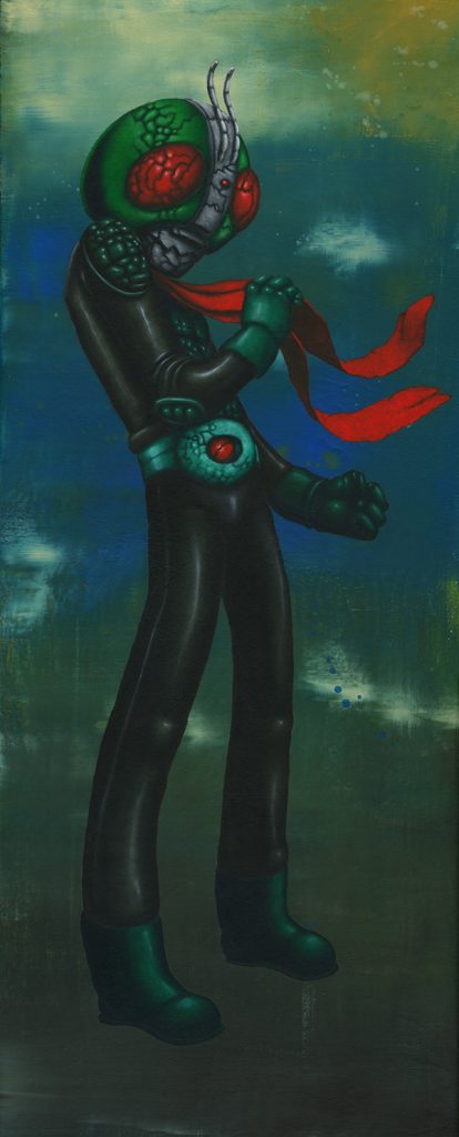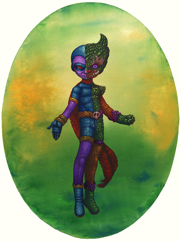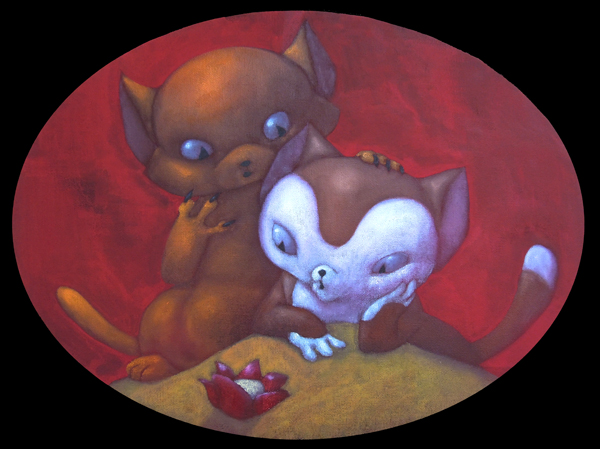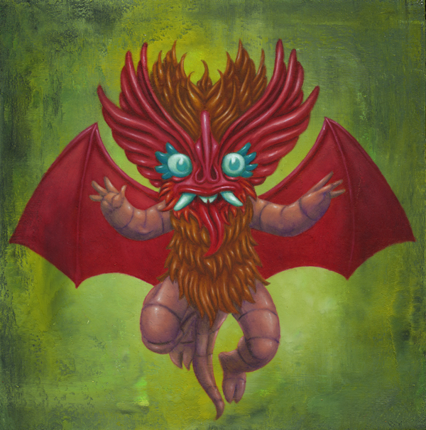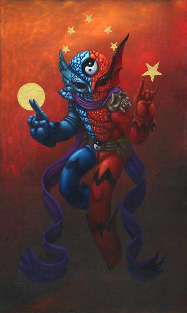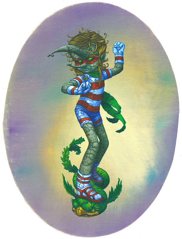 J’utilise des bâtons de peintures à L’huile et de l’acrylique, le tout sur des panneaux de bois.